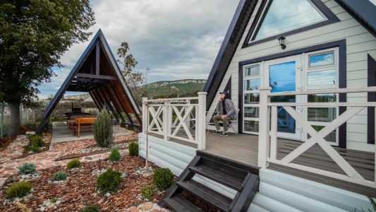 Треугольные домики «Шале» в Даховской с видом на горы.