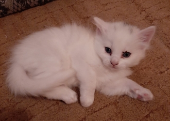 Приблудилась кошка похожая на ангорку. 3 апреля родила 5-х котят. Котята белые, пятен не много. Пушистые.